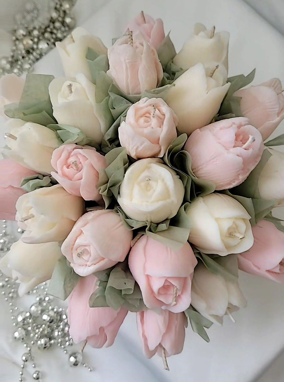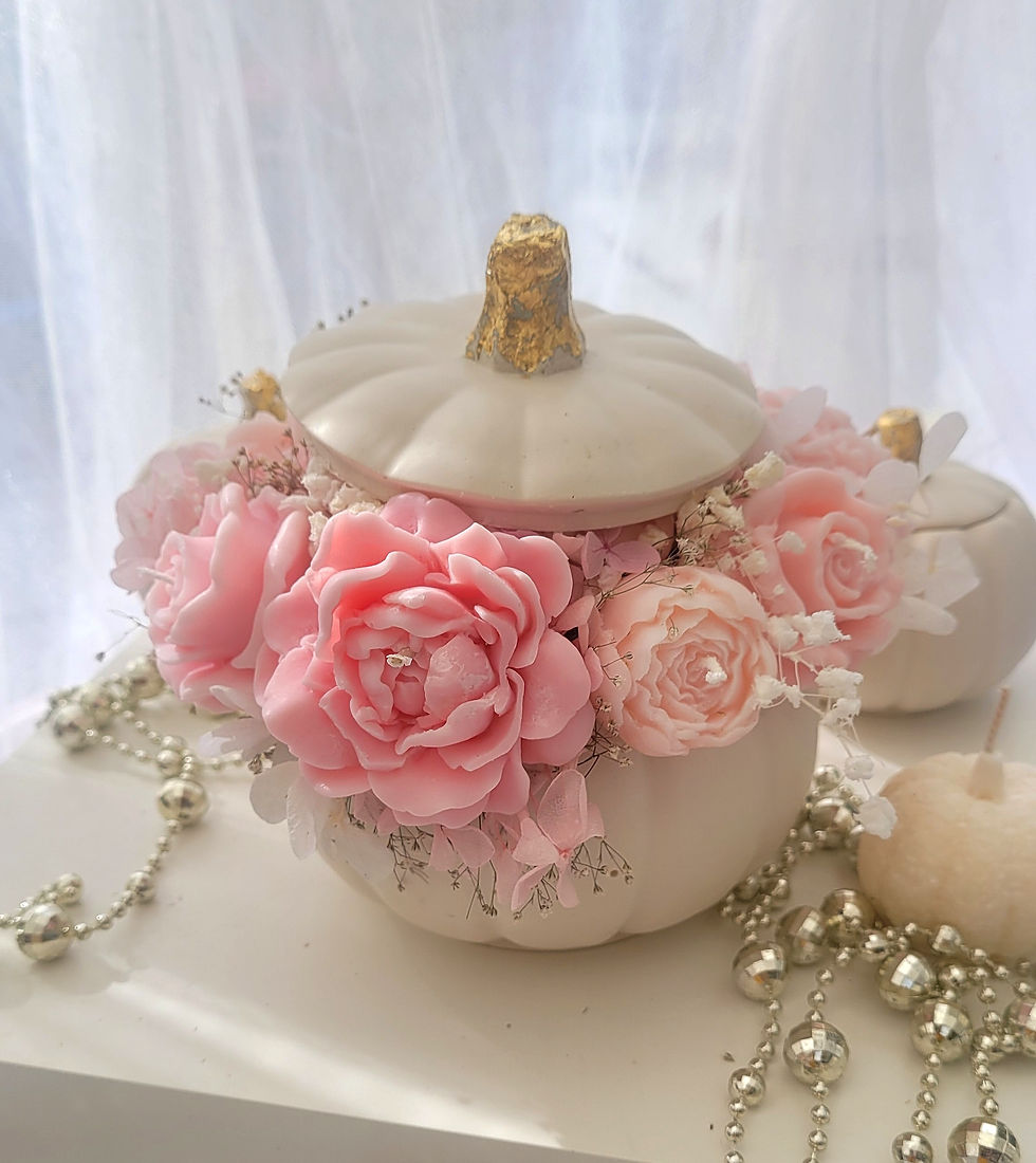 An enchanting bouquet of handcrafted soy-wax flowers, arranged in an elegant bag-style box. Creamy ivory blooms meet gentle sprigs of dried flowers, while a striking violet centerpiece adds a touch of twilight magic.